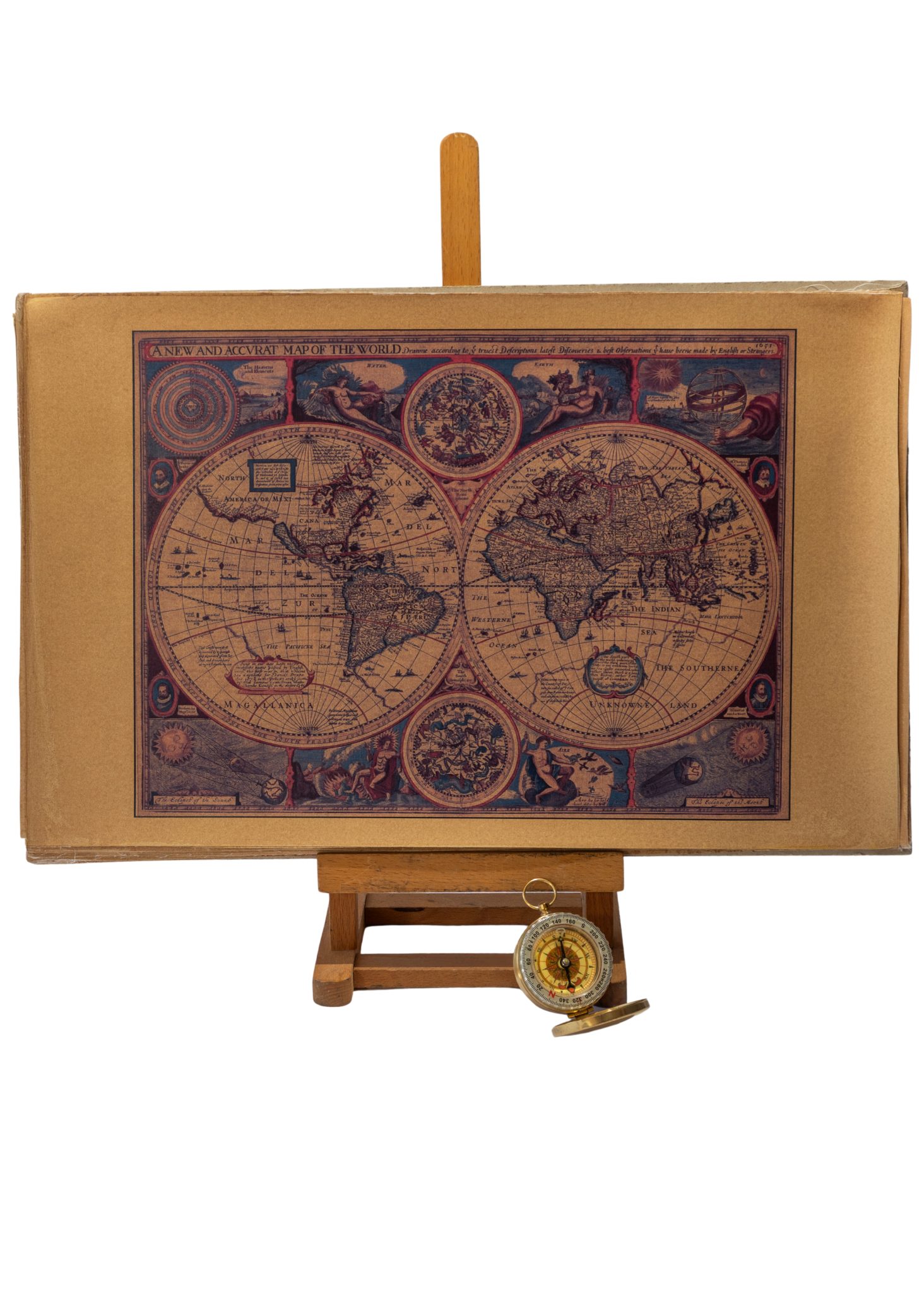 Este mapa, titulado “A New and Accvrat Map of the World”, fue publicado en Londres en 1626 por el cartógrafo John Speed. Presenta los hemisferios oriental y occidental en un estilo ornamental propio del siglo XVII, reflejando las exploraciones y el conocimiento geográfico de su época.