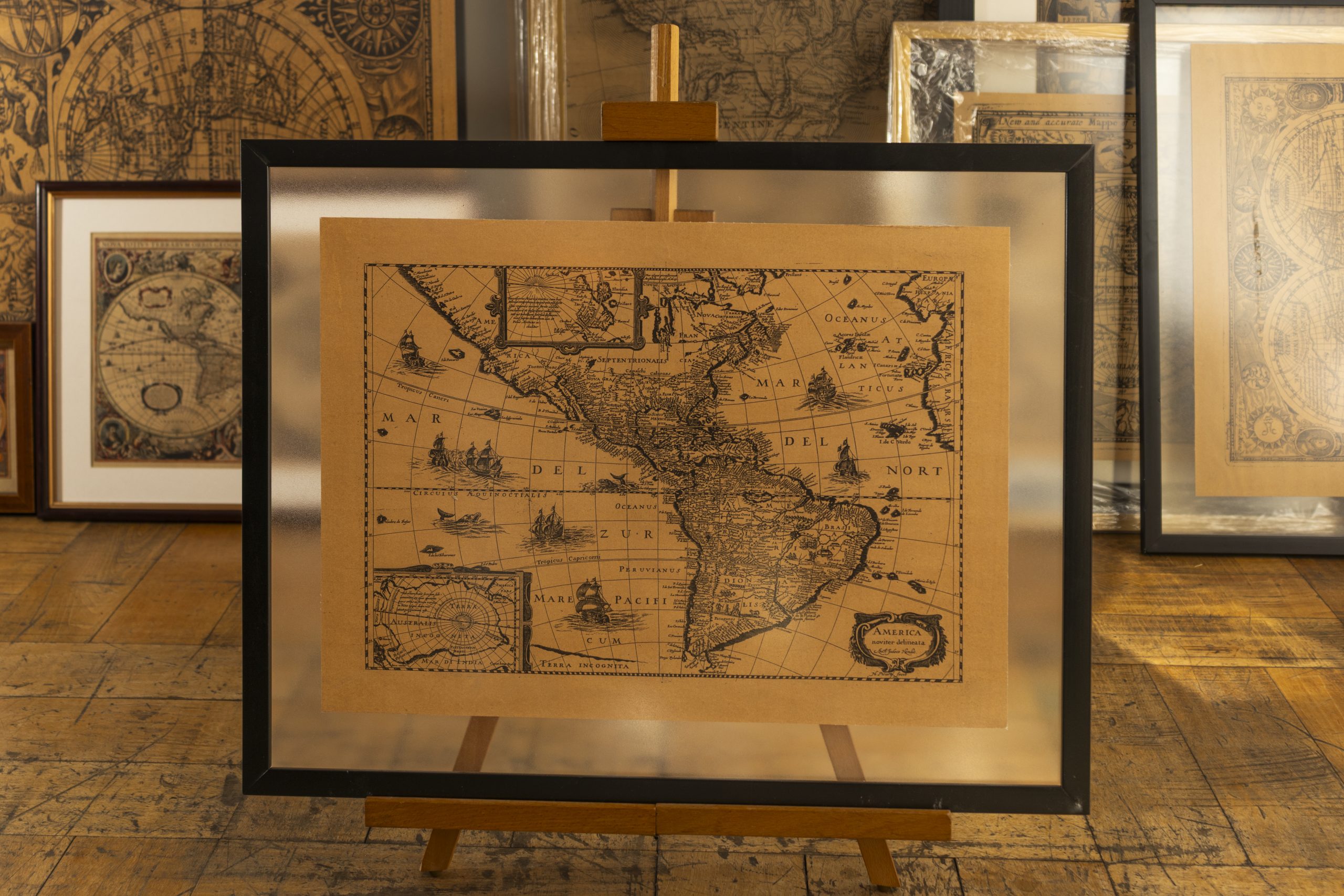 Hoja clásica de la Edad de Oro neerlandesa: America noviter delineata fijó la imagen continental en los atlas de 1641. Rodeada de naos y criaturas marinas, la cartografía se acompaña de insets polares de Groenlandia/Islandia y de la mítica Terra Australis.