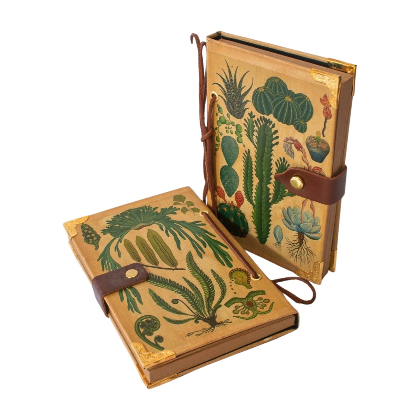 Portada y contraportada con ilustraciones científicas antiguas de plantas: destacan cactus, suculentas, helechos y especies tropicales en tonos verdes intensos.