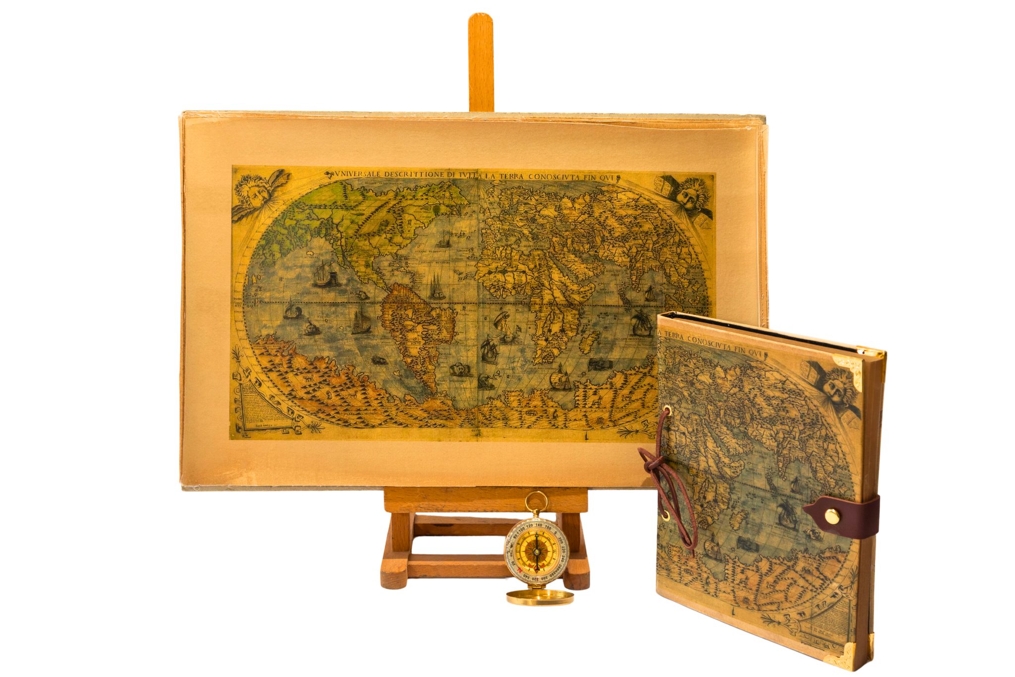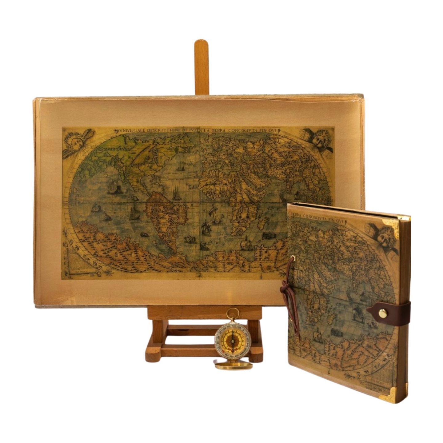 El mapa“‘Universale Descrittione di Tutta la Terra Conosciuta fin qui’ (1565), originalmente publicado por Paolo Forlani en Venecia, combina rigurosidad renacentista y fantasía cartográfica. Este mapa representa el mundo conocido en dos hemisferios, con América unida a Asia, amplios espacios de “Terra Australis”, islas imaginarias y adornos marinos como monstruos, navíos y cabezas de viento.