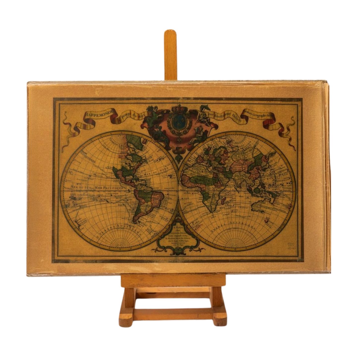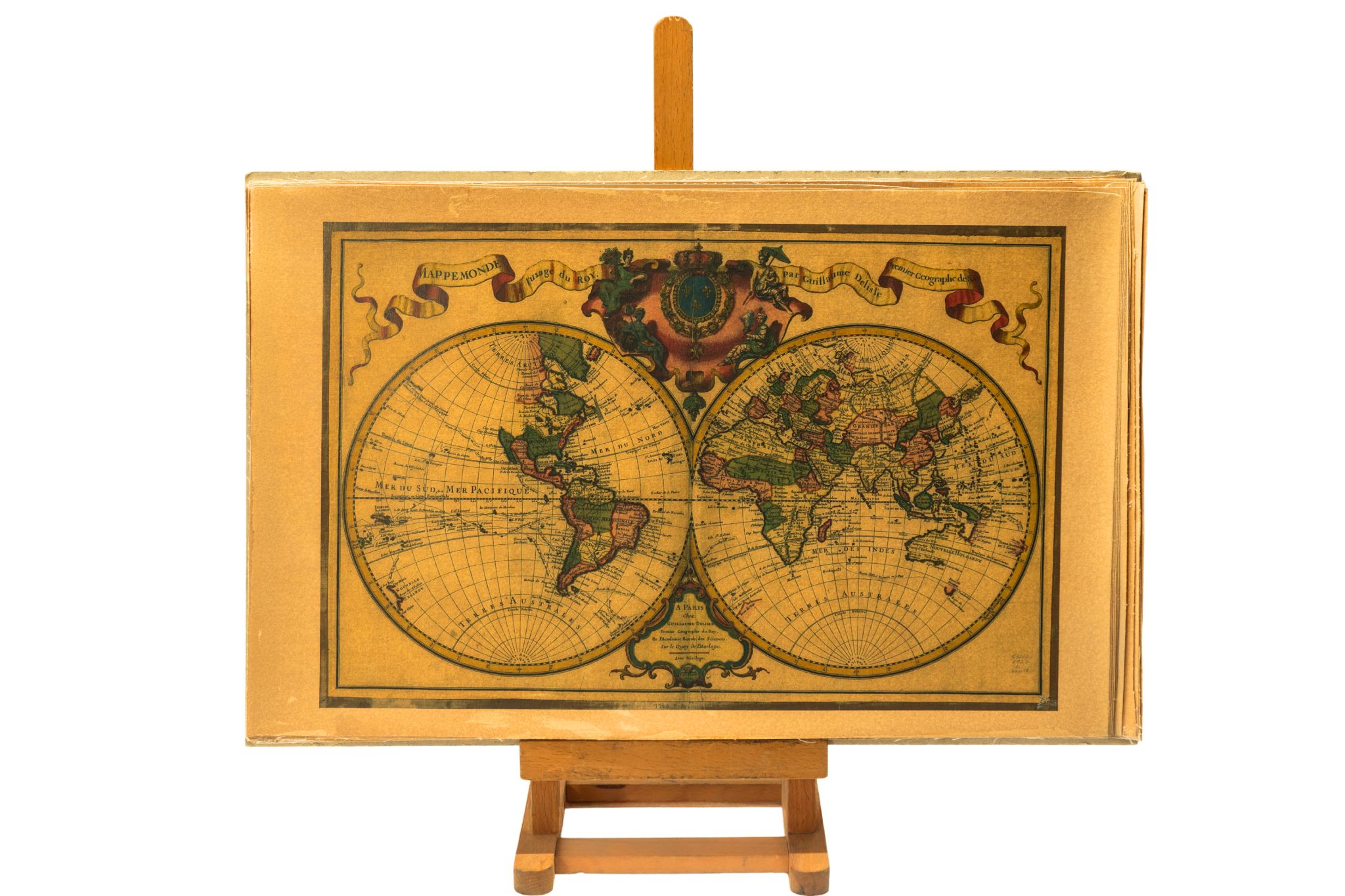 “’Mappemonde à l’usage du Roy’ (1720) de Guillaume Delisle fue uno de los primeros mapamundis científicos oficiales de Francia, destacando por su doble hemisferio, precisión cartográfica y rutas de navegantes emblemáticos.”