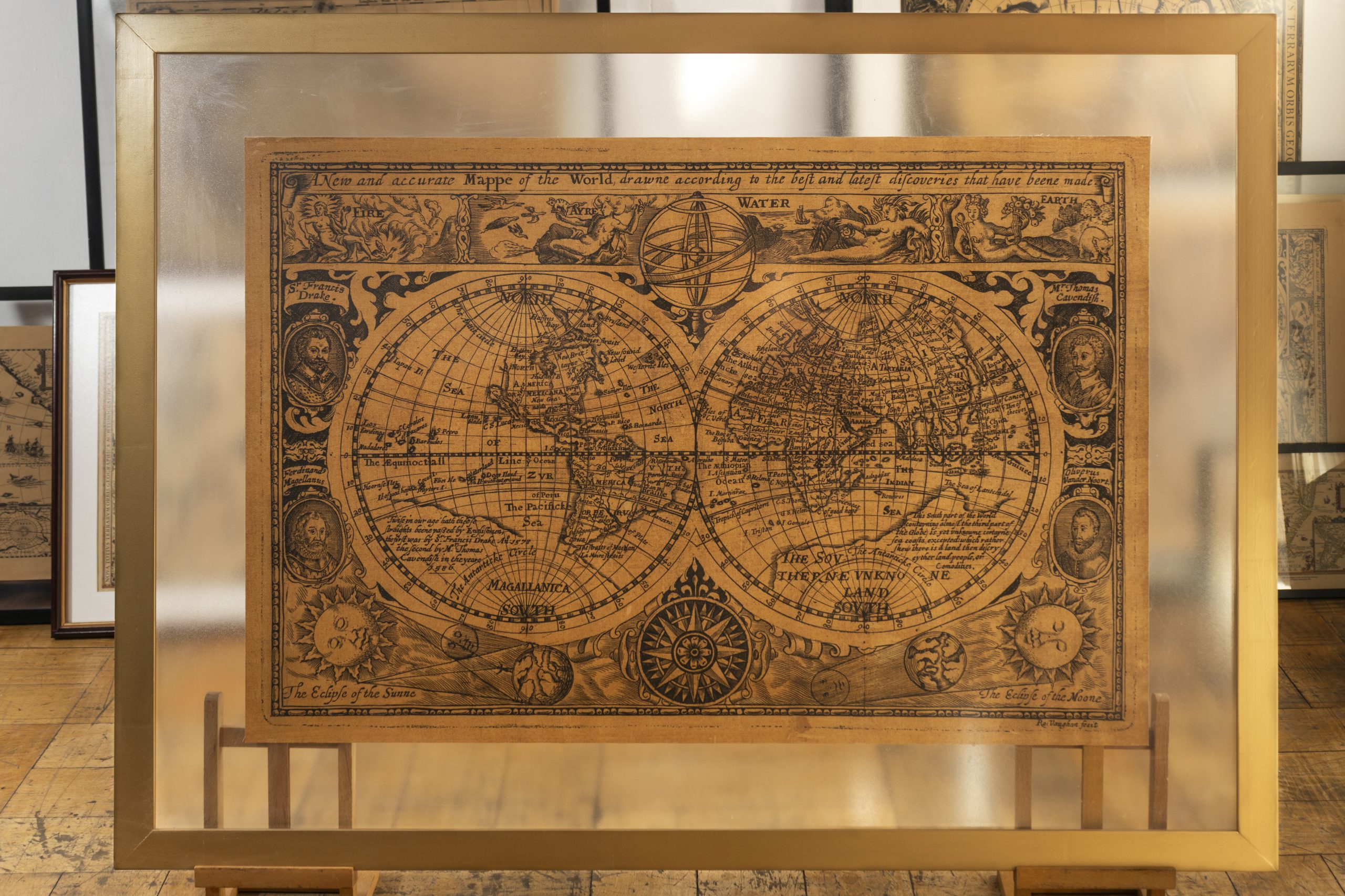 Planisferio inglés célebre por su programa decorativo barroco: los hemisferios terrestres se rodean de las alegorías de Tierra, Agua, Aire y Fuego, esferas celestes y retratos de los grandes circunnavegadores. Fechado 1626 y difundido en 1627 dentro del atlas mundial de Speed. Es el primer mapamundi publicado en un atlas inglés y uno de los más influyentes del siglo XVII.